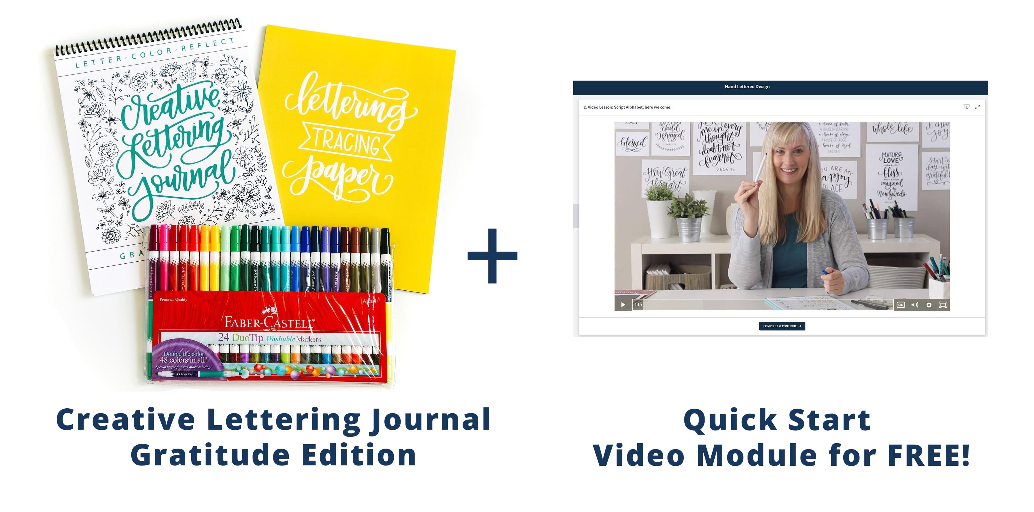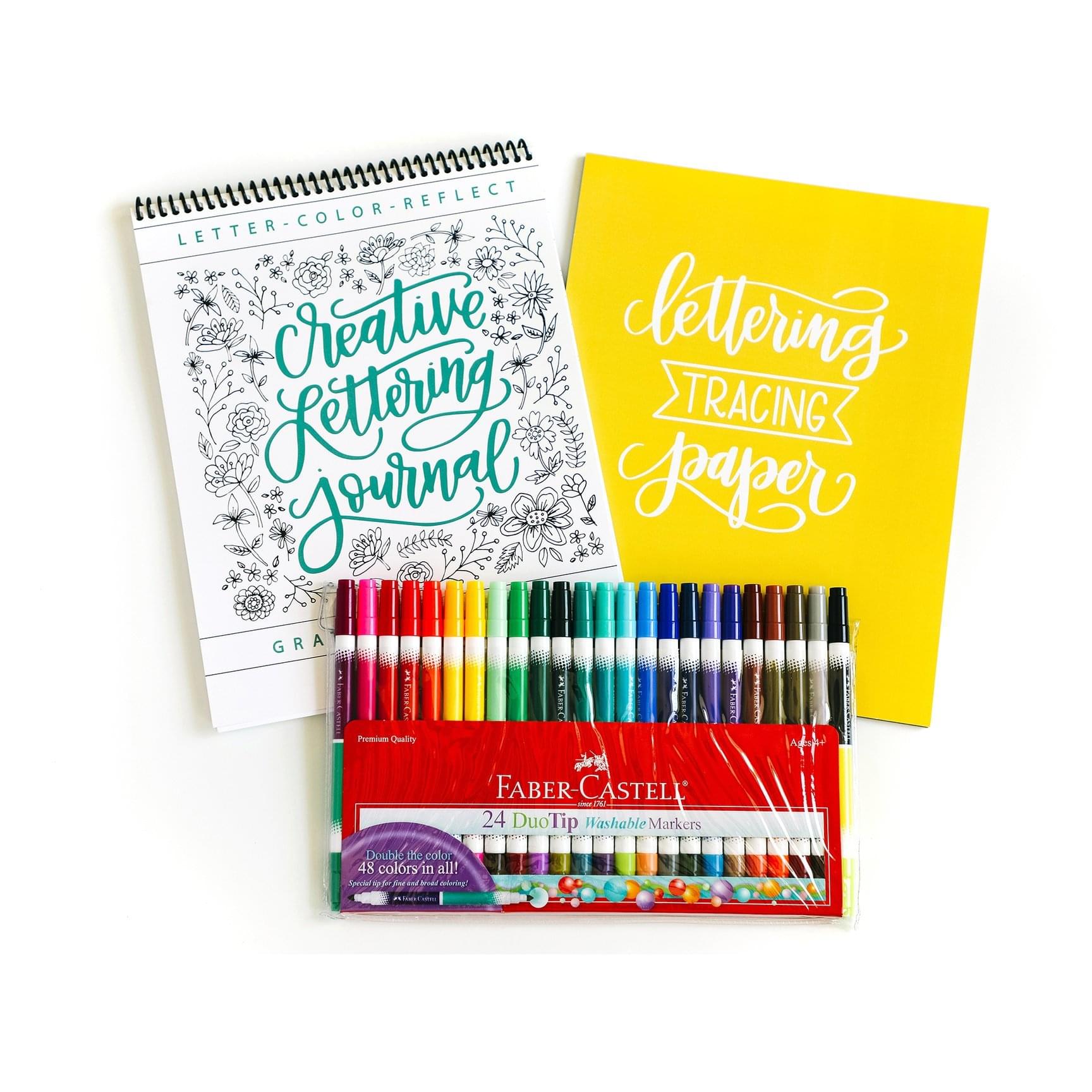 This bundle has everything you need to get started lettering. The bundle includes the Creative Lettering Journal, a set of 24 duo-tip markers (48 colors in total), and a set of our own of tracing paper.